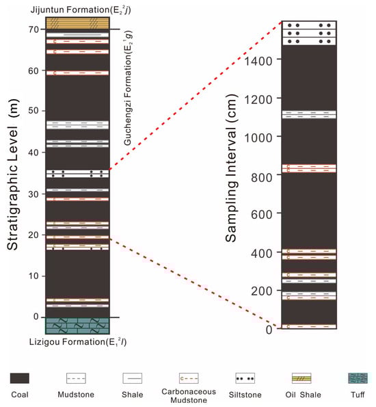 The Guchengzi Formation, located at the East Open Pit mining site (41°50′33.4″ N, 123°53′14.3″ E), has a thickness of approximately 70 m (Figure 2). The lithology of the collected samples comprises coal and carbonaceous mudstone. A total of 112 samples were collected along a vertical profile through a 14-m section. Each sample covered an interval of approximately 10 cm.