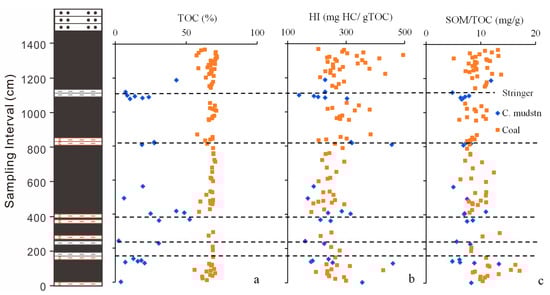 The TOC content spanned from 2.4 to 71.2 wt%. The samples were categorized into two groups based on a TOC cutoff of 55 wt%. This categorization was established by considering the minimum carbon content of 50 wt% for lignite and 60 wt% for bituminous coal, owing to their low maturity levels. A total of 87 coal samples displayed a TOC content ranging from 55.9 to 71.2 wt%, and 25 carbonaceous mudstone samples exhibited a TOC content within the range of 2.4 to 52.4 wt% (see Appendix A for details) (Figure 3a). Within the carbonaceous mudstone samples, HI values spanned within the range from 139 to 460 mg HC/g TOC. The coal samples displayed HI values ranging from 181 to 495 mg HC/g TOC (see Appendix A for details) (Figure 3b). Carbonaceous mudstones displayed SOM yields within the range from 4.8 to 11.8 mg/g TOC. Coal samples exhibited SOM yields ranging from 5.0 to 17.1 mg/g TOC (Figure 3c). The vitrinite reflectance measured at the sample site was approximately 0.5%, indicating a subbituminous A rank classification.