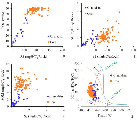 Hydrocarbon yield (S1 and S2) and TOC correlations, SOM analysis, and kerogen characterization in carbonaceous mudstones and coals. C. mudstn: carbonaceous mudstone (applies to the legend in subsequent figures). (a) TOC versus S2; (b) S1 versus S2; (c) SOM versus S1; and (d) HI versus Tmax.