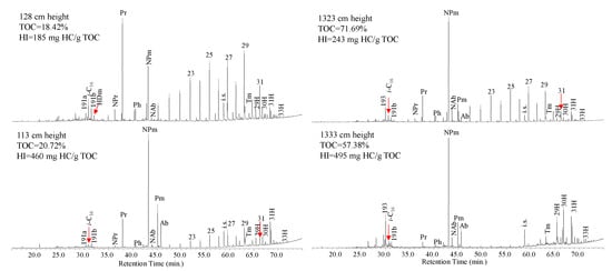 Figure 5 displays the Total Ion Chromatograms (TICs) of the saturated hydrocarbon fractions in representative samples taken from both low and high Hydrogen Index (HI) values of coaly shale and coals within the Guchengzi Formation. In the low HI value carbonaceous mudstone (185 mg HC/g TOC) and coal (243 mg HC/g TOC) samples, the primary components of the saturated fraction consist of n-alkanes, isoprenoid alkanes, and diterpanes. The high HI value carbonaceous mudstone (460 mg HC/g TOC) and coal (495 mg HC/g TOC) samples are predominantly tricyclic diterpanes and hopanes, with n-alkanes being present in significantly lower concentrations. Additionally, bicyclic sesquiterpanes are observed in all samples, with generally modest relative abundance (Figure 5).