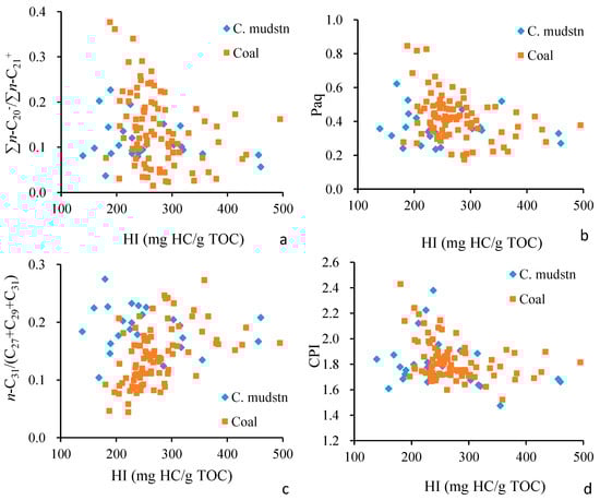 The high Carbon Preference Index (CPI), as defined by Bray and Evans [33] [CPI = 2 × (C25 + C27 + C29 + C31)/(C24 + 2 × (C26 + C28 + C30) + C32], is recognized as a distinguishing characteristic of low-rank coal. Within our study, CPI values were observed within the range from 1.5 to 2.4 for both coaly shale and coal samples. A negative correlation was identified between the CPI and HI values in coals, with a linear coefficient of 0.139 (Figure 6d).