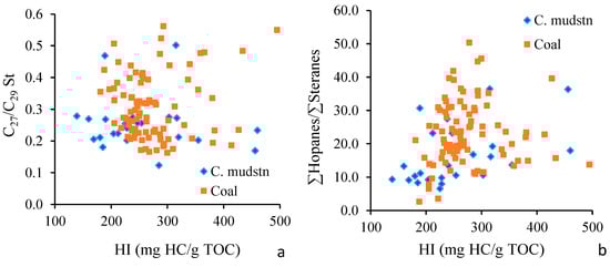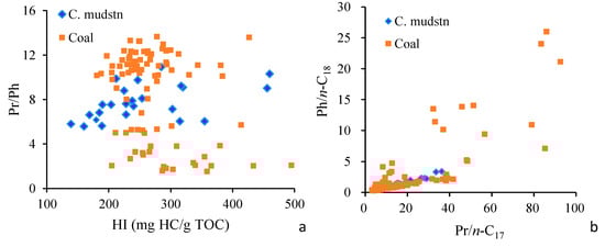 All samples contain the acyclic isoprenoids, in particular pristane (Pr) and phytane (Ph). The Pr/Ph ratio displayed a wide range, with values ranging from 1.5 to 13.7 for the coals and from 5.6 to 11.2 for the carbonaceous mudstones. A significant portion of samples with high Pr/Ph ratios (>3.0) indicates the deposition of terrigenous organic matter under oxic conditions [34]. Conversely, a few samples with low Pr/Ph ratios (<3.0) can be interpreted as products of deposition under dysoxic to oxic conditions. The Pr/Ph ratios show a general increasing trend with HI values in the carbonaceous mudstones but a slight decreasing trend within the coals (Figure 7a).