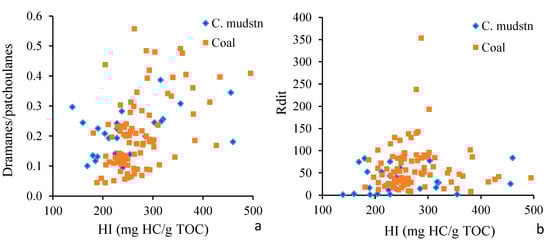 Relation between sesqui- and diterpane-related parameters and HI values in the analyzed samples. (a) Dramanes/patchoulanes vs. HI; (b) Rdit vs. HI.