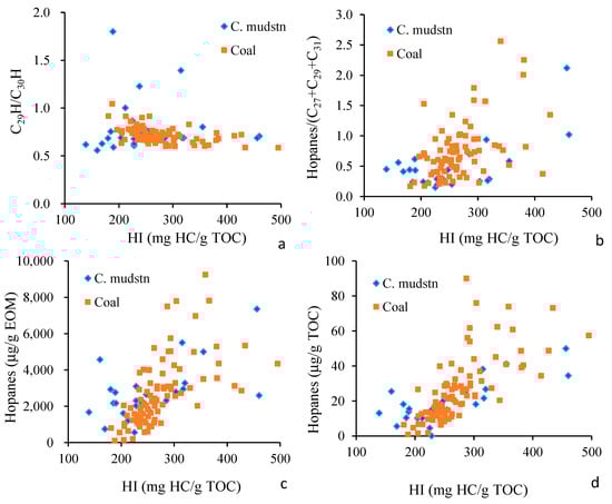 Relation between hopane-related parameters and HI values in the studied samples. (a) C29H/C30H vs. HI; (b) Hopanes/n-(C27 + C29 + C31) vs. HI; (c) Hopanes (μg/g SOM) vs. HI; (d) Hopanes (μg/g TOC) vs. HI.
