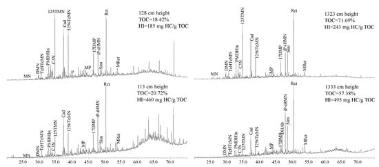 TICs of aromatic hydrocarbon fractions from samples with low and high HI values in carbonaceous mudstone and coals of the Guchengzi Formation. Peak assignments are as follows: MN—methylnaphthalene; DMN—dimethylnaphthalenes; TeHTeMN—1,2,3,4-tetrahydro-2,2,5,7-tetramethylnaphthalene; PMDHIn—1,1,4,5,6-pentamethyl-2,3-dihydro-1H-indene; C3N—trimethylnaphthalenes (TMN); Cad—cadalene (4-isopropyl-1,6-dimethylnapthalene); iP-iHMN—6-isopropyl-2-methyl-1-(4-methylpentyl)naphthalene; P—phenanthrene; MP—methylphenanthrenes; DMP—dimethylphenanthrenes; DHAb—dehydroabietane; Sim—simonellite; Ret—retene; MRet—methylretenes.