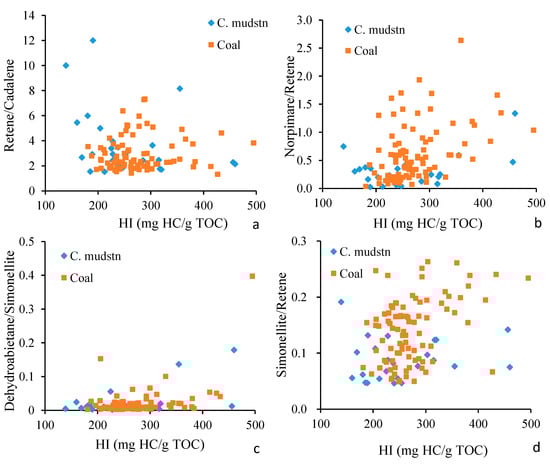 Relation between source input and the degree of diterpenoid aromatization parameters and HI values in the examined samples: (a) Retene/Cadalene vs. HI values; (b) Norpimare/Retene vs. HI values; (c) Dehydroabietane/Simonellite vs. HI values; (d) Simonellite/Retene vs. HI values.