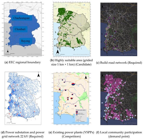 Required facilities were constrained to the following criteria for CSBPPs such as a road network (Figure 2c) or a power grid network (22 kV) with location of power substations identified as red symbols (Figure 2d) [32,36].