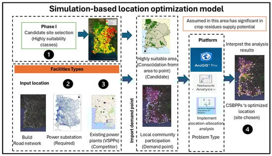 Phase 2: Optimizing CSBPPs locations using Location–Allocation Modeling. An optimization model based on the p-median problem was implemented on the ArcGIS Pro 3.0.2 platform to identify optimal CSBPP locations based on the minimum distances between demand locations and CSBPP locations. The constraints of local demand and plant capacity were also applied. Then, the levelized cost of electricity (LCOE) was analyzed for potential CSBPPs. Sensitivity analysis of biomass fuel types was also conducted for future fuel supply management.