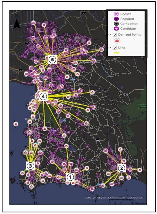 - Chosen (4) is the CSBPP site that was once determined by the location–allocation solver as a candidate facility for the solution.