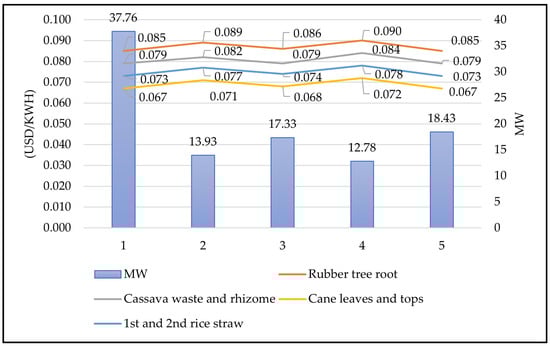 To conduct the sensitivity analysis, the LCOE was also estimated based on the cost of different biomass fuel types and the results are illustrated in Figure 5. It is worth noting that in this calculation, per unit fuel cost was assumed not to vary with transportation distance or processing costs in order to reflect the competitive nature of the biomass supply business. The range of the LCOE across five candidate locations was the lowest for sugarcane leaves and tops ($0.067–$0.072 USD/kWh) and the highest for rubber tree root ($0.085–$0.090 USD/kWh). The results clearly indicate that the management of fuel supply, both amount and cost, is an important key parameter to ensure the sustainability of the CSBPP project and to minimize LCOE. When planning a CSBPP project, the seasonal availability of biomass, as shown in Figures S1–S5 in the Supplementary File, should be taken into consideration.