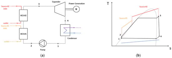 The HRS in the series configuration of combined heat sources comprises two heat exchangers arranged in series within the ORC layout, as depicted in Figure 2a. The ORC working medium enters the bottom heat exchanger (HEX #1) in a subcooled liquid state and is heated by the HTF of the first source. It then proceeds to the top heat exchanger, which is connected to the second source (HEX #2). The type of process the working medium undergoes in each heat exchanger (preheating, evaporation, and superheating) depends on the system design. Typically, the low-grade source is connected to the first heat exchanger and the source of higher temperature is connected to the second, as exhibited in the temperature-specific enthalpy (T-s) diagram of Figure 2b. However, this arrangement is not absolute and can vary depending on the system design. These variations in heat source combinations allow for the exploration of optimal designs for heat recovery systems in series configurations.