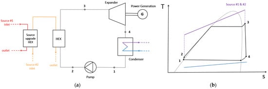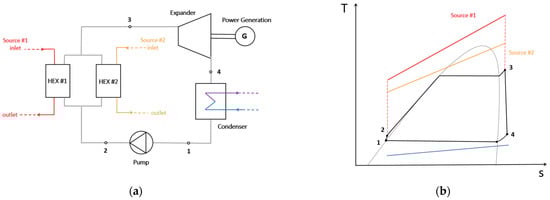 Parallel configuration of hybrid ORC: (a) System layout; (b) T-s depiction.