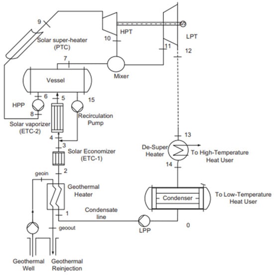 Double-stage hybrid ORC configuration integrating both PTCs and ETCs, and a geothermal source (derived from [49], Copyright (2025), with permission from Elsevier).