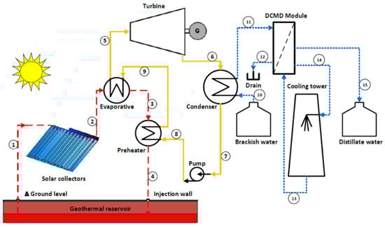 - Almehmadi, F.A.; Najib, A.; Ali, E.; Alqaed, S.; Mustafa, J.; Al-Ansary, H. Thermodynamic optimization of hybrid solar-geothermal power plant coupled with DCMD for water and electricity production: A Case study at Ain Khulab, Saudi Arabia. Energy Rep. 2023, 10, 3240–3251. [Google Scholar] [CrossRef]