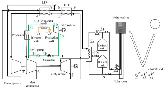 Solar–geothermal energy integration based on a supercritical CO2 Brayton and ORC combined system (derived from [73], Copyright (2025), with permission from Elsevier).
