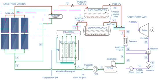 - Orumiyehei, A.; Ameri, M.; Nobakhti, M.H.; Zareh, M.; Edalati, S. Transient simulation of hybridized system: Waste heat recovery system integrated to ORC and Linear Fresnel collectors from energy and exergy viewpoint. Renew. Energy 2022, 185, 172–186. [Google Scholar] [CrossRef]