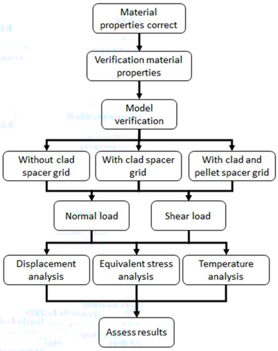 To perform the torsional analysis of the spacer grid, it is necessary to verify the material properties and validate the spacer grid model composed of shell elements. The modeling of the spacer grid was performed using ANSYS2024R2 SpaceClaim. Three different models were used for analysis and analyzed using ANSYS2024R2. Figure 2 illustrates the study process. Each model underwent displacement analysis, equivalent stress analysis, and temperature analysis for both normal load and shear load. The temperature analysis was conducted for room temperature (21 °C), core inlet temperature (290 °C), and core outlet temperature (325 °C).