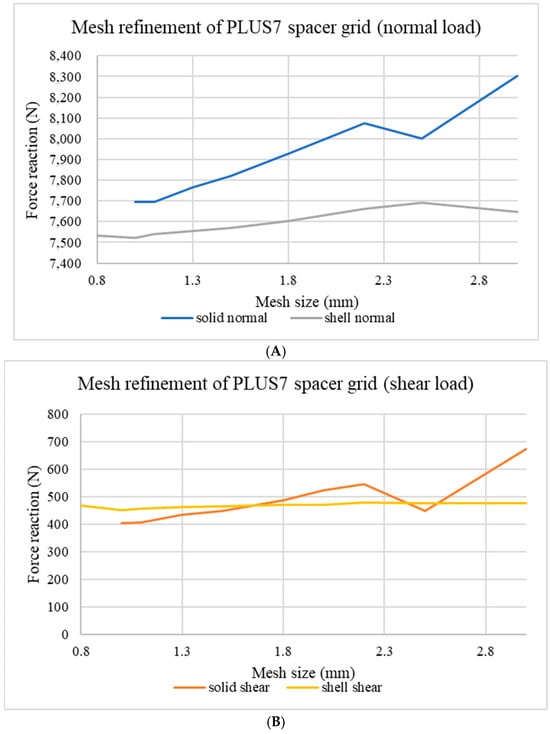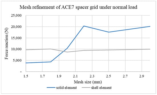 In our study, we carried out analysis using both shell elements and solid elements. A comparative evaluation was performed against experimental results [3]. This comparison was conducted through static compression, as depicted in Figure 1. The experiment was conducted under normal load conditions using a 17 × 17 spacer grid. To compare the models, a mesh convergence study was performed on the ACE7 spacer grid. The convergence results for both solid and shell element models are crucial for obtaining reliable finite element method (FEM) solutions (Figure 4). The shell element model converged well across the range of element sizes tested. However, while the solid element model converged at an element size of 1.5 mm, further mesh refinement failed to produce valid meshes.