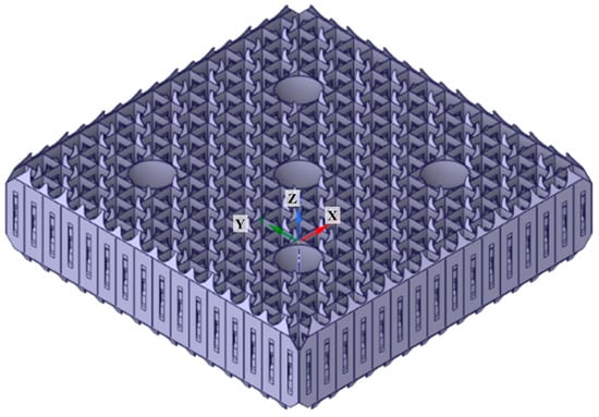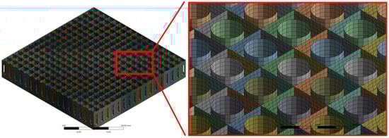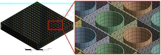As shown in Figure 4, the shell model demonstrates consistent values during the mesh independence test, offering advantages of both accurate analysis and reduced computation time. The 17 × 17 spacer grid modeled by solid and shell elements are shown in Figure 5 and Figure 6. In Figure 5, we can notice that the solid meshes of the spacer grid plates do not have mid-nodes. In order to increase the accuracy of analysis, we set the order of the solid element to be of second order. In Figure 6, the shell mesh consists of all quad elements that produce smaller numerical errors for the same element sizes.