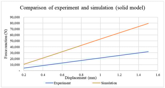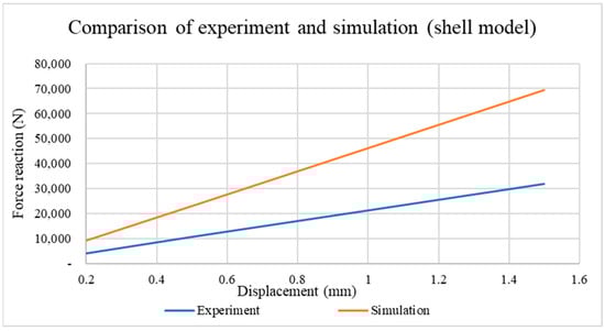 The experimental load–displacement curve and analysis are shown in Figure 7 and Figure 8 for the solid model and shell model, respectively. A comparison of these results revealed discrepancies, primarily attributed to simplifications in the finite element (FE) model. The actual spacer grid features welded intersections at the top and bottom, which significantly complicate FE modeling. Consequently, these intersections were modeled as solid connections, resulting in an overestimation of stiffness in the simulation, as evidenced in Figure 7. To better correlate the simulation with the experimental data, which represent the actual deformation behavior, the elastic modulus of the model was adjusted. The differences were calculated for the same deformation . The values obtained through force reaction (F) were used, and a comparison of the variable K revealed a discrepancy of 2.17 times between the simulation and experimental values. This result was used to adjust the Young’s modulus. Table 2 displays the material properties with the adjusted Young’s modulus.
