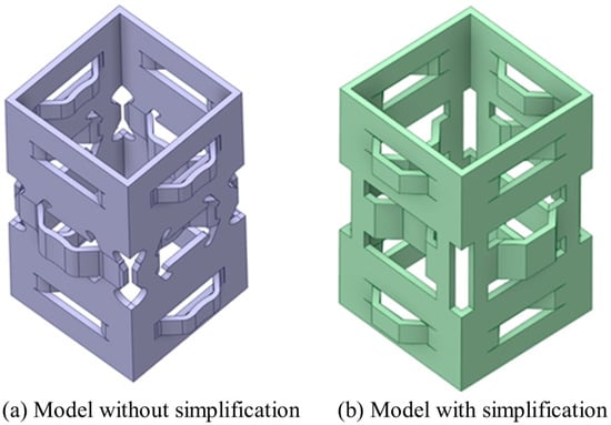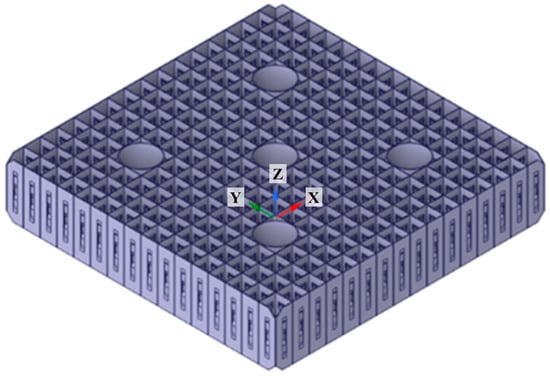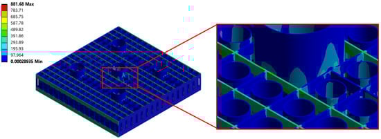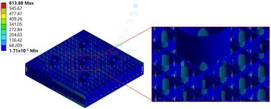 As the mesh size decreased, the results showed a tendency to converge. In the case of the shell spacer grid, smaller mesh sizes were applied more smoothly compared to the solid spacer grid, and the computation time was also shorter. It was confirmed that the shell model produced suitable results at a mesh size of 1 mm. In the solid model, even with a mesh size of 1 mm, no mid-element was generated for the thin plates that make up the structure. The results for this mesh size are presented in Figure 17. This suggests that smaller mesh sizes are not feasible due to the limitations of computational resources. With a 1 mm mesh size, the single-step calculation time was 500 s for the solid model and 70 s for the shell model, making the shell model approximately 7.14 times faster.