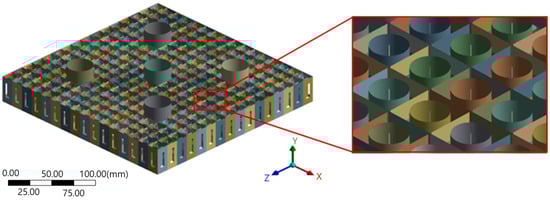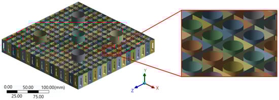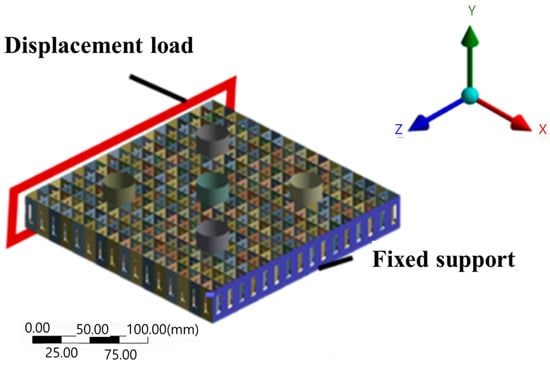 The displacement feature in ANSYS Mechanical was utilized to analyze the normal and shear stiffness of the spacer grid. In both the normal and shear loading cases, the +x face was subjected to fixed support, while the −x face experienced displacement. For the normal load case, displacement was applied in the +x direction, ranging from 0.2 mm up to just before the yield stress. For the shear load case, displacement was applied in the −z direction, ranging from 0.5 mm up to just before the yield stress, to analyze the shear direction. The boundary conditions are shown in Figure 18.