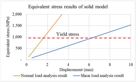 The comparison between the solid model and the shell model showed a 1.13-fold difference under the normal load and a 1.40-fold difference under the shear load. The results were similar to those observed in the equivalent stress analysis, with a larger difference occurring under the shear load compared to the normal load.