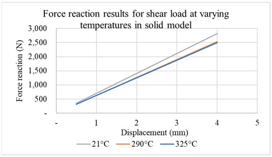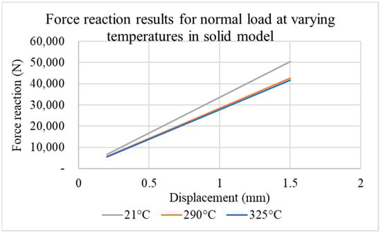To examine the force reaction of the solid model, the analysis was performed below the yield stress point. The normal load was analyzed up to 1.5 mm, and the shear load was analyzed up to 4 mm. The analysis revealed a 47.7-fold difference between the normal load and shear load at the same displacement of 1 mm, emphasizing the need for further experiment to confirm this result.