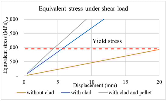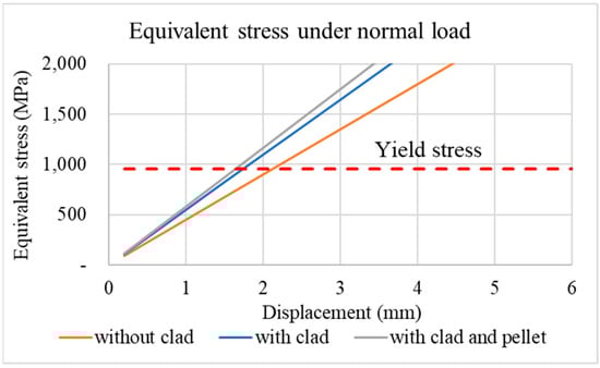 For the elastic analysis, we need to determine how much deformation can be applied before yielding. For this purpose, we carried out stress analysis, and the applied deformation and resulting equivalent stresses were plotted as shown in Figure 19 for the normal load and shear load cases. The yield strength of Zircaloy-4 is 955 MPa, as indicated by the horizontal dotted line in Figure 19. The figure shows the results at room temperature (21 °C).