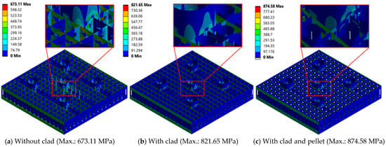 The maximum displacements before exceeding the yield stress were considered for the three models. The results for the 1.5 mm displacement under normal stiffness conditions are presented in Figure 26, and the results for the 4 mm displacement under shear load conditions are shown in Figure 27. The maximum stress was observed around the CEA guide tube under both loading conditions. It was confirmed that adding clad and pellet increases stress resistance under both normal and shear loads, with clad having a particularly significant effect under shear stress, resulting in over threefold stress difference depending on their presence. Under normal load conditions, clad and pellet play a role in resisting grid deformation. However, greater maximum deformation occurs under shear load, indicating that the grid deforms more readily without clad.