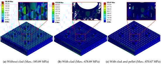 This section describes the results of the stress analysis of the solid model of the spacer grid with clad. The applied boundary conditions were set as shown in Figure 18, and the analysis was performed using the material properties adjusted for the solid model, where the material properties are shown in Table 2. The analysis of the solid model was used to compare the results of the shell model.