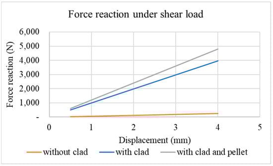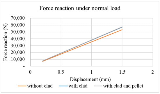 The analysis was performed up to the yield stress point, with the normal load analyzed up to 1.5 mm and the shear load analyzed up to 4 mm. Under normal stiffness conditions, differences of less than 1.08 times were observed between the models depending on the presence of clad and pellet, indicating almost negligible differences. In the case of shear stiffness, there was a 1.21-fold difference depending on the presence of pellet, a 15.60-fold difference depending on the presence of clad, and an 18.90-fold difference depending on both clad and pellet. This demonstrates significant differences under shear load conditions based on the presence or absence of clad and pellet. The results are shown in Figure 28 and Figure 29, representing the force reaction. The orange line represents the model without clad, the blue line represents the model with clad, and the gray line represents the model with both clad and pellet.