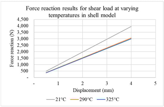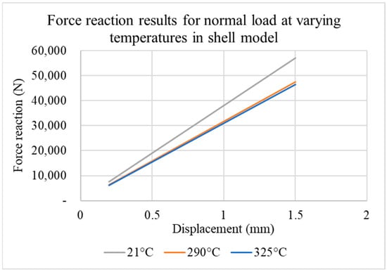 Since material properties vary as temperature varies, this section studies the stiffness of the spacer grid under varying temperatures. The reaction force analysis was conducted using the shell model of a spacer grid with clad. In Table 2, the material properties of the shell model were applied. As shown in Figure 30 and Figure 31, a 1.18-fold difference was observed between room temperature and core inlet temperature, a 1.02-fold difference between core inlet and core outlet temperatures, and a 1.21-fold difference between room temperature and core outlet temperature.