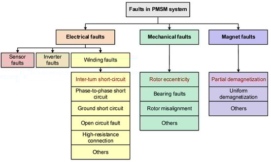 Classification of faults in the PMSM drive system. The detailed explanation of inter-turn short-circuit fault, partial demagnetization fault, and rotor eccentricity fault is shown in Section 2.1, Section 3.1 and Section 4.1.