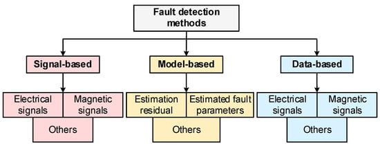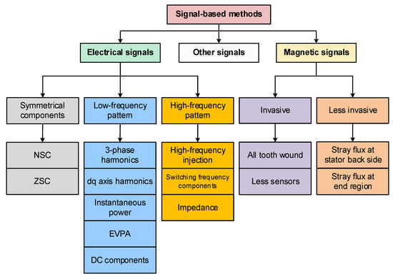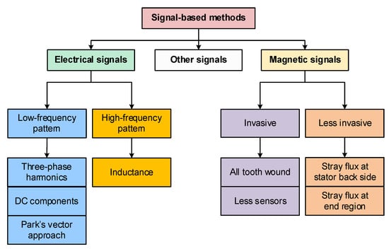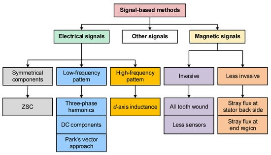The signal-based methods refer to those concentrating on extracting explicit signatures from specific signals with time or frequency analysis techniques. The signals adopted for fault detection can be either common electrical signals available in a PMSM drive system or signals obtained with extra sensors such as Hall sensors or search coils. Generally speaking, the signal-based methods can be grouped as electrical signal-based and magnetic signal-based. Obviously, the signatures in electrical signals and magnetic signals are different. Thus, they have different SNR, advantages, and disadvantages. The detailed classification is shown in Figure 5.