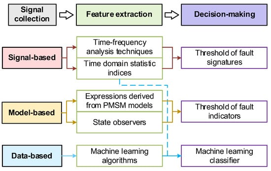 In this paper, the detection methods of three typical faults in PMSMs are reviewed, i.e., the ITSC fault, PM partial demagnetization (PD) fault, and eccentricity fault, because they are very common while difficult to detect. The detection methods of each fault are classified into three major categories, i.e., the signal-based, model-based, and data-based methods [3,4,8], as illustrated in Figure 2. Signal-based methods mainly concentrate on extracting the fault-related features of signals directly or indirectly. Model-based methods treat the fault as a variation of the model of the motor, hence using various ways to observe the variation of the model. Data-based methods utilize the algorithms of machine learning, trying to extract high-dimensional hidden information about fault features from the data. Figure 3 concludes the basic principles of signal-, model-, and data-based methods from the perspective of the general fault detection procedure, i.e., feature extraction and decision-making processes.