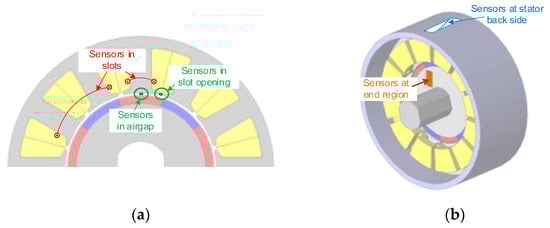 Invasive methods place the sensors on the main flux path of the machine, as shown in Figure 6a. Thus, sensors are usually placed in the slots [72,73], stator yoke [74], around the tooth coils [75], etc., meaning that significant modification of the machine is required. Da et al. [72] utilized the search coils on all teeth for the detection of various faults. The polar diagram is then drawn to see the distortion of the airgap flux linkage due to an ITSC fault. Similarly, Zeng et al. [76] also use search coils wound on a tooth. The frequency components (2hk ± 1)fe (hk is the carrier wave ratio) are found to have high SNR, and a fault index based on these two components is proposed.