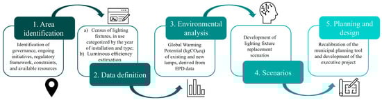 In this context, the methodology presented here aims to provide a standard procedure for the agile and accurate estimation of the environmental performance of public lighting. This procedure, which supports the planning, design, and long-term management of fixture replacement interventions, uses EPDs as the data source for the technical and environmental performance of the replacement fixtures. It also evaluates the CO2-equivalent emissions in two scenarios for the temporal organization of replacements in order to answer the question(s) of whether and when to replace fixtures.