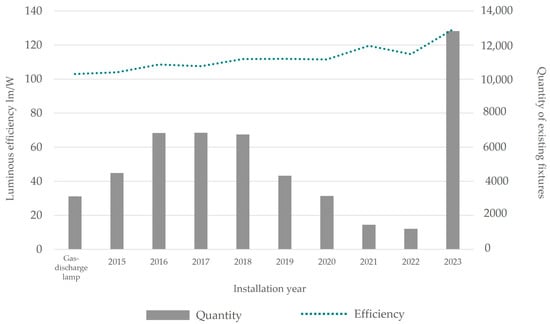 Classification of existing fixtures based on installation year and evaluation of luminous efficiency (luminous efficiency lm/W on the left and number of fixtures on the right).