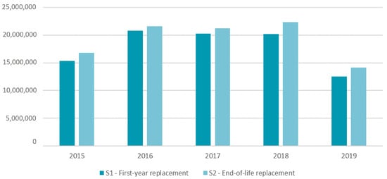 The inventory reveals that the oldest fixtures were installed in 2015. The calculation of luminous efficiency shows that the new fixture is more efficient than all of those installed up to 2023. Nevertheless, the analysis of the PRIC indicates that only those installed between 2015 and 2019 can be replaced. It is worth noting that, as shown in Figure 2, the fixtures installed in 2022 have a slightly lower efficiency than expected, as fixtures with the “furnishing” functional type are less efficient than streetlights. For this reason, the installation years that can be included in the scenarios to be modeled refer to the comparison between replacing the fixtures in the first year and maintaining only the LED fixtures installed from 2015 to 2019.