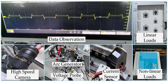 A series arc fault test platform was constructed in accordance with the IEC 62606 standard [21], shown in Figure 1. The platform can replicate series arcs resulting from inadequate contact and deteriorating insulation under various operational settings. The testing platform comprises a 220 V/50 Hz AC power supply, a load branch, a data acquisition component, an arc generator, and additional elements. The arc generator can produce two types of arcs: point contact and carbonization path. To comprehensively understand the phenomenon of arc randomness, arc current and voltage were measured using current sensors and voltage measuring devices, while the Phantom V611 high-speed camera was employed to examine and document the arc topography features during arcing. The Phantom V611 high-speed camera (AMETEK® Group, Edison, NJ, USA) supports a resolution of 1280 × 800 and a shooting rate of 30,000 frames per second, fulfilling the experimental criteria for real-time capture of arc discharge dynamics. Figure 2 shows the real test platform photo.