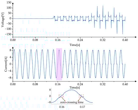 The AC current has a zero-crossing characteristic. When the arc burns, the thermal emission degree at the zero-crossing point of the current will be reduced, and the arc voltage of the resistive load will also be reduced, resulting in a decrease in the field emission electrons, so the AC arc current will be impacted by zero-crossing phenomenon [25]. The zero-crossing time is positively correlated with the arc voltage. When the electrode spacing is constant, the arc voltage changes randomly due to the local electric field change caused by electron collision formed by the field emission between the arcs. The change in the diameter of the arc and the conductivity of the particles in the electrode gap will cause a random change in the zero-crossing time of the arc current [12,25]. Therefore, the random change of the zero-crossing time reflects the randomness of the arc voltage.