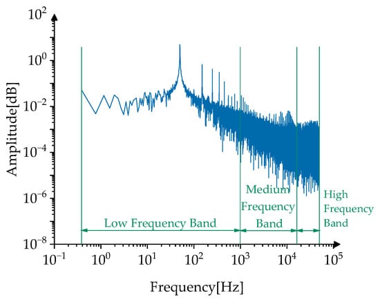 To accurately represent the trend of low-frequency components and the distribution of high-frequency components in arc fault currents, it is essential to differentiate between low-frequency and high-frequency bands, as indicated by the preceding analysis of time-domain features. Consequently, the discrete Fourier transform was applied to the arc current, segmenting it into equal-length time windows, and the arc fault current signal in the frequency domain was discretized and analyzed. The equation for the discrete Fourier transform is as follows: