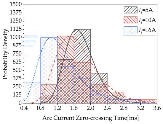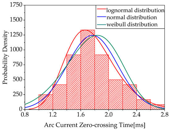 This study examined the probability distribution of arc zero-crossing time by computing the zero-crossing time of the arc current within a specified time interval during a single cycle. It employed log-normal, normal, and Weibull distribution functions to model the probability density of arc zero-crossing time. Table 2 and Figure 5 illustrate the fitting efficacy of the three aforementioned probability density functions for arc zero-crossing duration at the 5 A current level. To facilitate a clearer comparison of the fitting efficacy of various probability density functions regarding the zero-crossing duration of the arc current, the Kolmogorov–Smirnov (K-S) test was employed to evaluate the goodness of fit of these probability density functions. A greater p-value indicates that the data distribution closely resembles the probability density function distribution. If p < 0.05, the data are deemed incompatible with the distribution. Table 2 indicates that the p-value for the log-normal distribution at the 5 A current level is the highest and substantially exceeds the p-values of the other two distributions. Upon analyzing a substantial dataset of arc current zero-crossing duration across all current levels, the p-value for the log-normal distribution consistently exhibited the highest value in all instances. Consequently, it could be inferred that the arc current zero-crossing time adheres to a log-normal distribution.