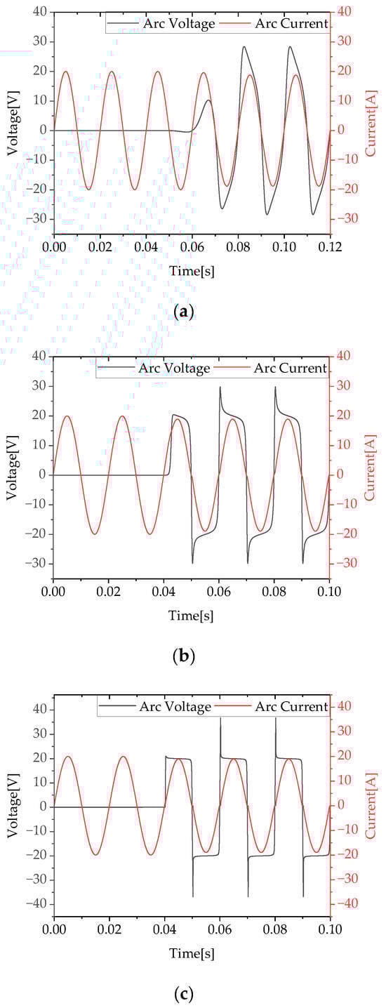 The arc voltage and current curves when τ changes. (a) = 3 × s; (b) = 3 × s; (c) = 3 × s.