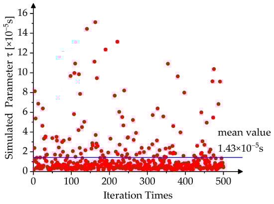 The lognrnd function in MATLAB was applied to generate a log-normal distribution random number, which was substituted into (5) to calculate , and then substituted into (11) to calculate . Figure 9 shows the result of calculating the time constant of the arc current 500 times. It can be seen that the average value of is 1.43 × s, and most data points are concentrated below 5 × s, which conforms to the law of arc current time constant in Section 3.3.