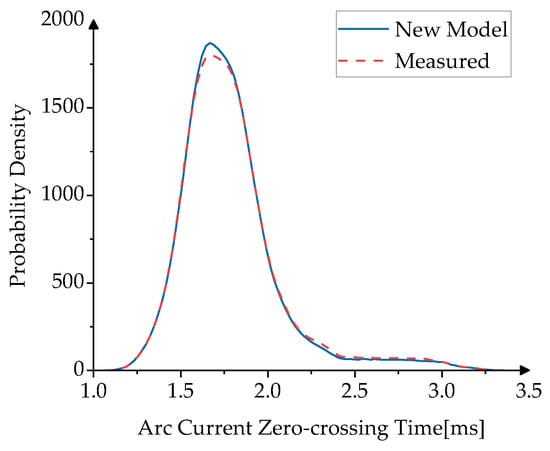 Comparison of the simulated and actual arc current zero-crossing time distributions.
