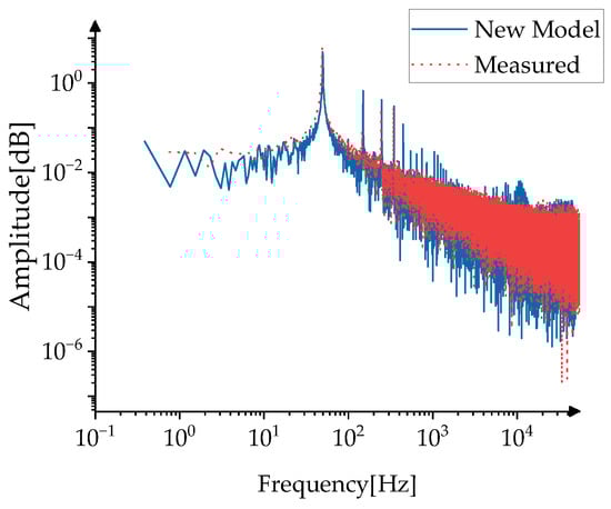 In order to verify the frequency domain performance of the arc fault current simulation model, the fast Fourier transform was performed on the simulated arc current and the measured arc current, respectively. The results are shown in Figure 11. The spectrum of the simulation data and the spectrum of the test part are basically the same, and the spectrum amplitude of the two is basically the same. The correlation coefficient between the calculated simulation and the measured current spectrum is 95.36%. On the whole, the simulation data can basically describe the typical frequency band of arc fault, which is of certain significance in analyzing the frequency domain features of arc fault.