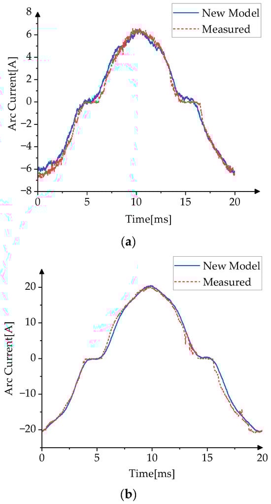Comparison of the simulated and actual arc current waveforms with linear load. (a) Arc current waveforms of 5 A. (b) Arc current waveforms of 16 A.