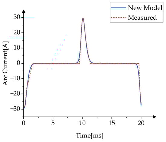 The improved arc model was tested for both linear and nonlinear loads. Figure 13 illustrates a comparison between the predicted arc current waveform and the measured arc current waveform in the presence of nonlinear loads. The simulated current waveform exhibits a similarity of 99.03%, demonstrating that the model effectively represents the arc current features of both linear and nonlinear loads, thus fulfilling the requirements for low-voltage AC arc analysis and characterization in real-world conditions.